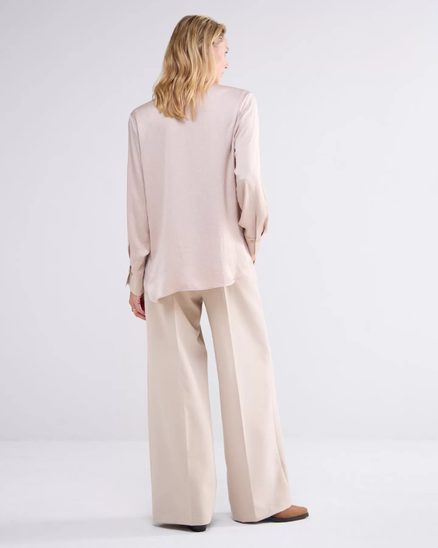 Klassieke blouse van soepelvallende glanzende stof. De blouse heeft een afgeronde onderkant en knoopsluiting met ton-sur-ton knoopjes.