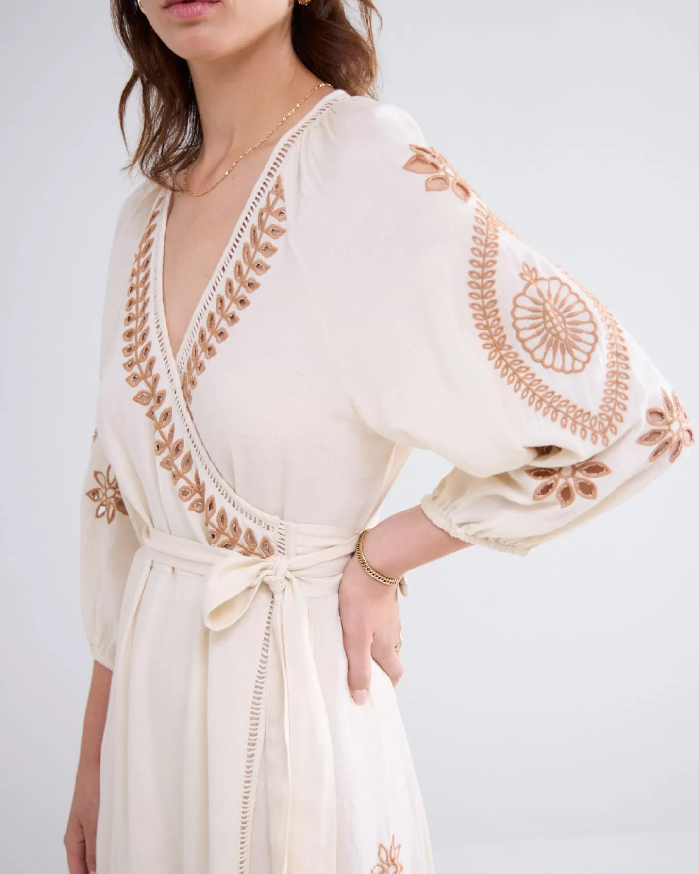 Lange wikkel jurk met geborduurde artwork details. De jurk heeft een 3/4 mouw lengte.