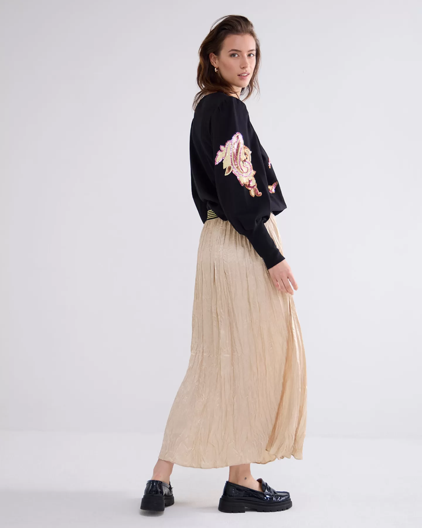Metallic rok tot onder de knie, uitgevoerd in een glanzend, gekreukelde stof met goudkleurige tint. De rok heeft een gestreepte elastische tailleband.