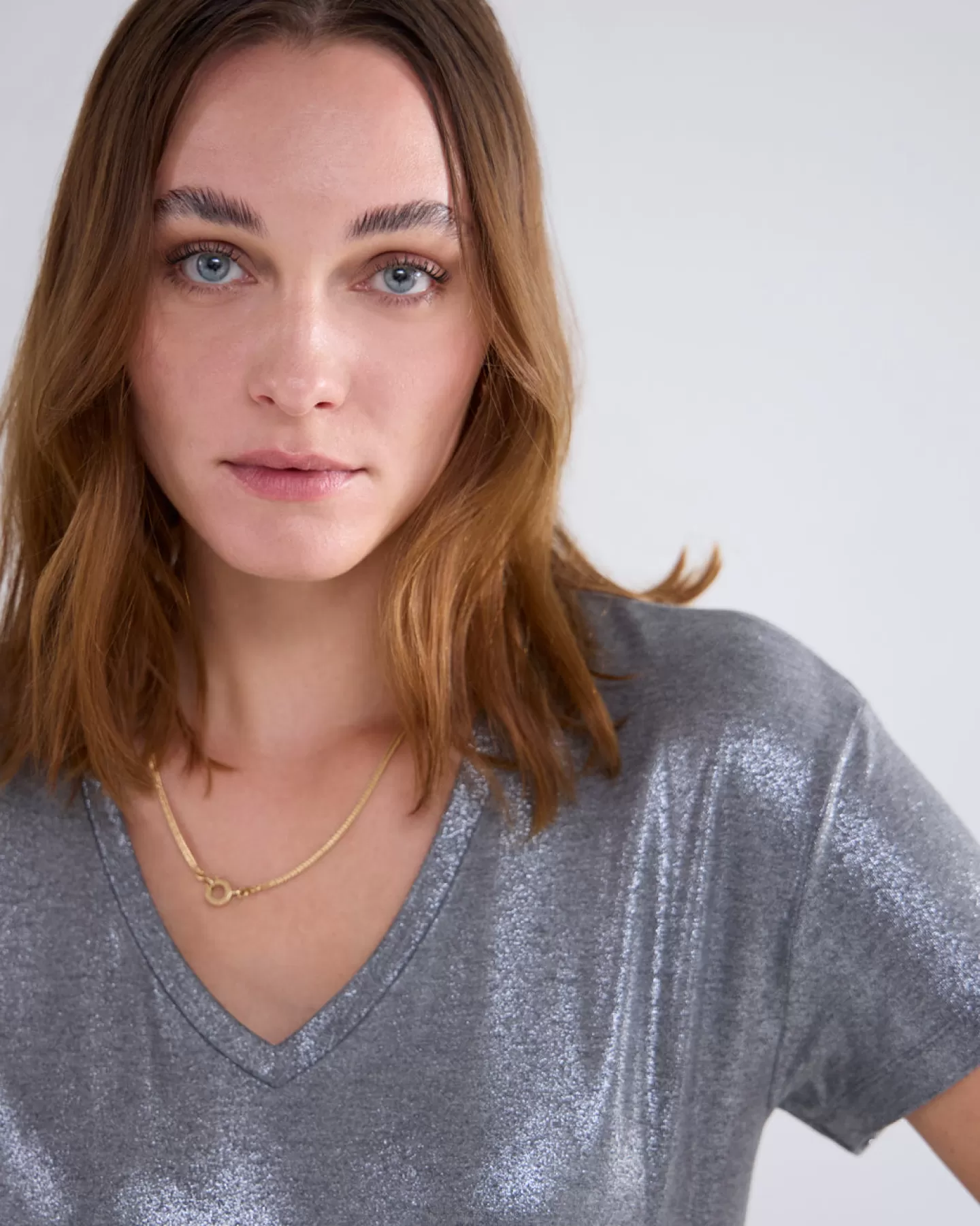 Top met normale pasvorm en een ronde V-halslijn, voorzien van korte pofmouwen. Gemaakt van glanzend bedrukte viscose jersey kwaliteit.