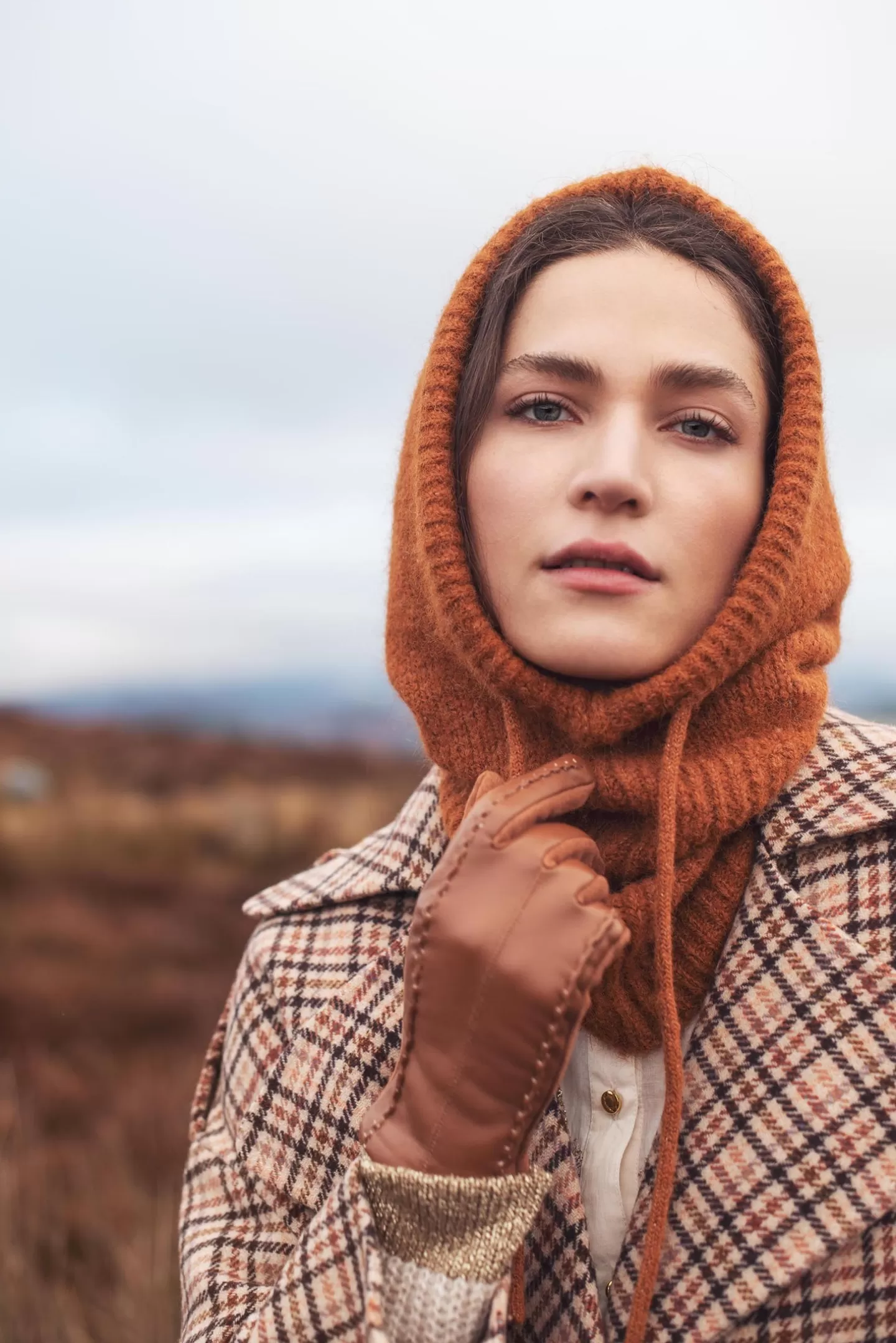 Balaclava muts met koordjes, gebreid in een zacht garen.