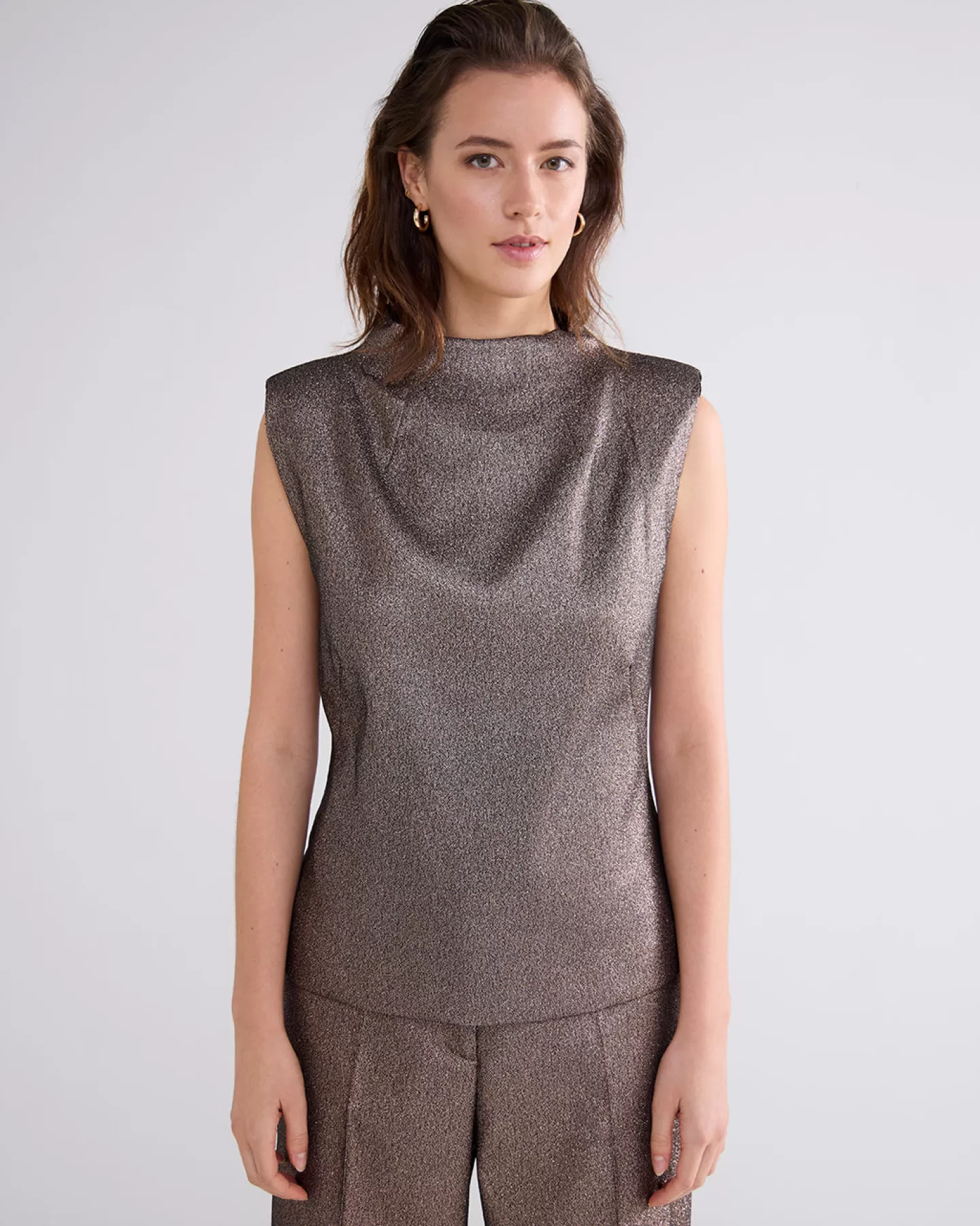 De blouse is gemaakt van een overall bedrukte, soepelvallende stof en heeft een staanderkraagje met plooivorming
