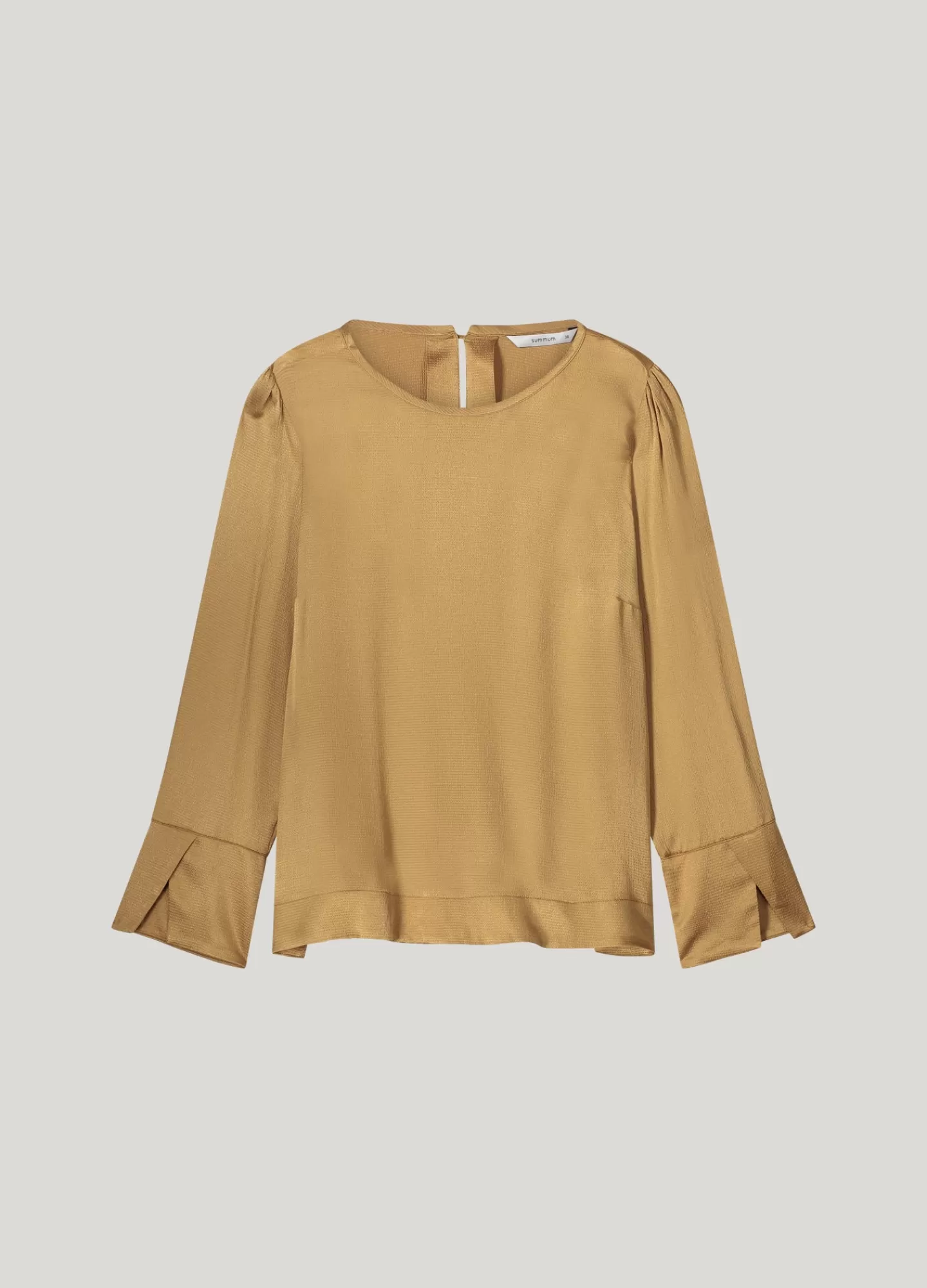 Top met een ronde hals en een splitje en knoopje aan de achterkant. De top heeft brede manchetten met overslagsplit en coupenaadjes op borsthoogte. Gemaakt van gehamerd viscose met een glanzende afwerking.