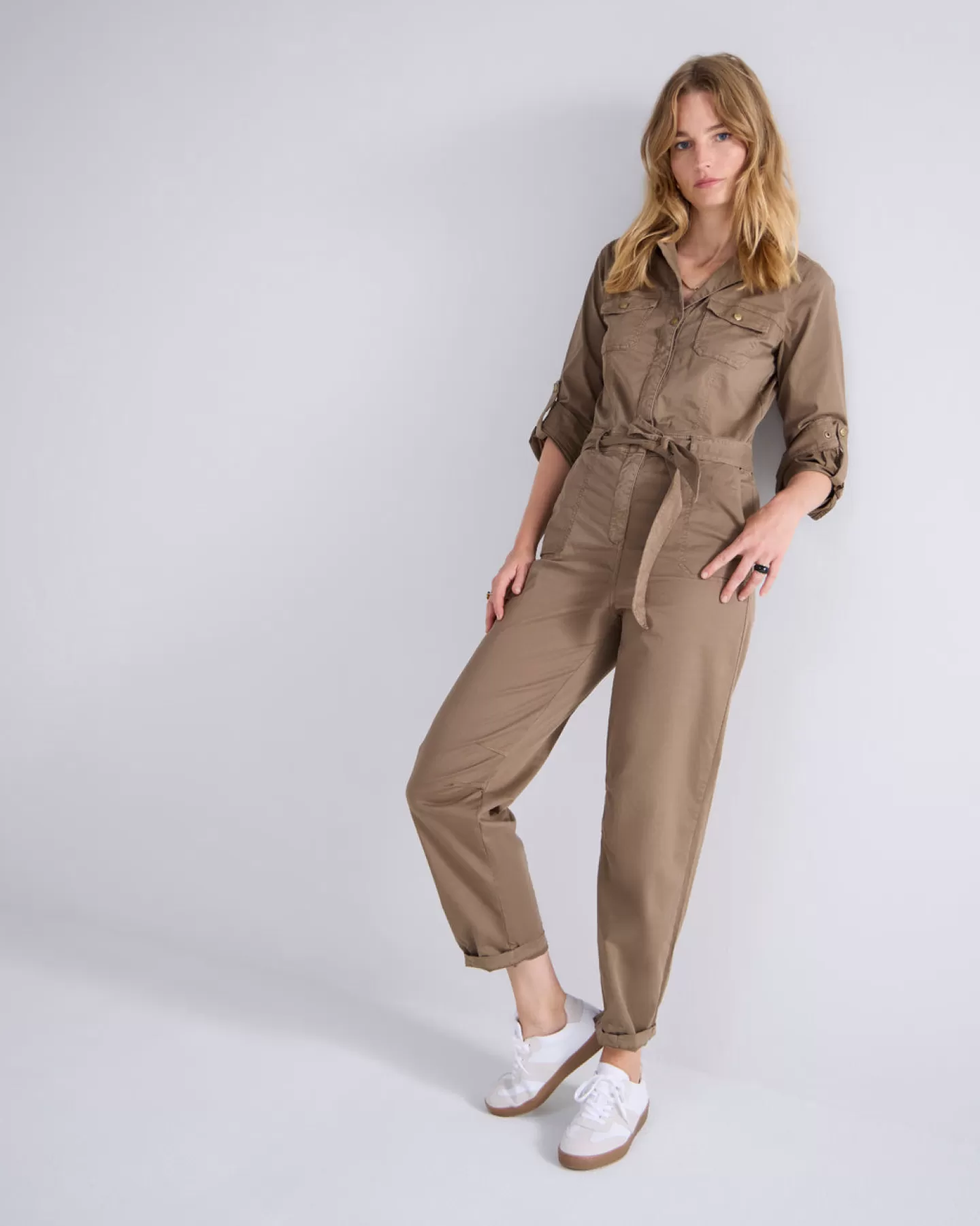 Cargostijl jumpsuit in een tencel twillstof. De jumpsuit heeft een ritssluiting met drukknoop en ceintuur in de taille.