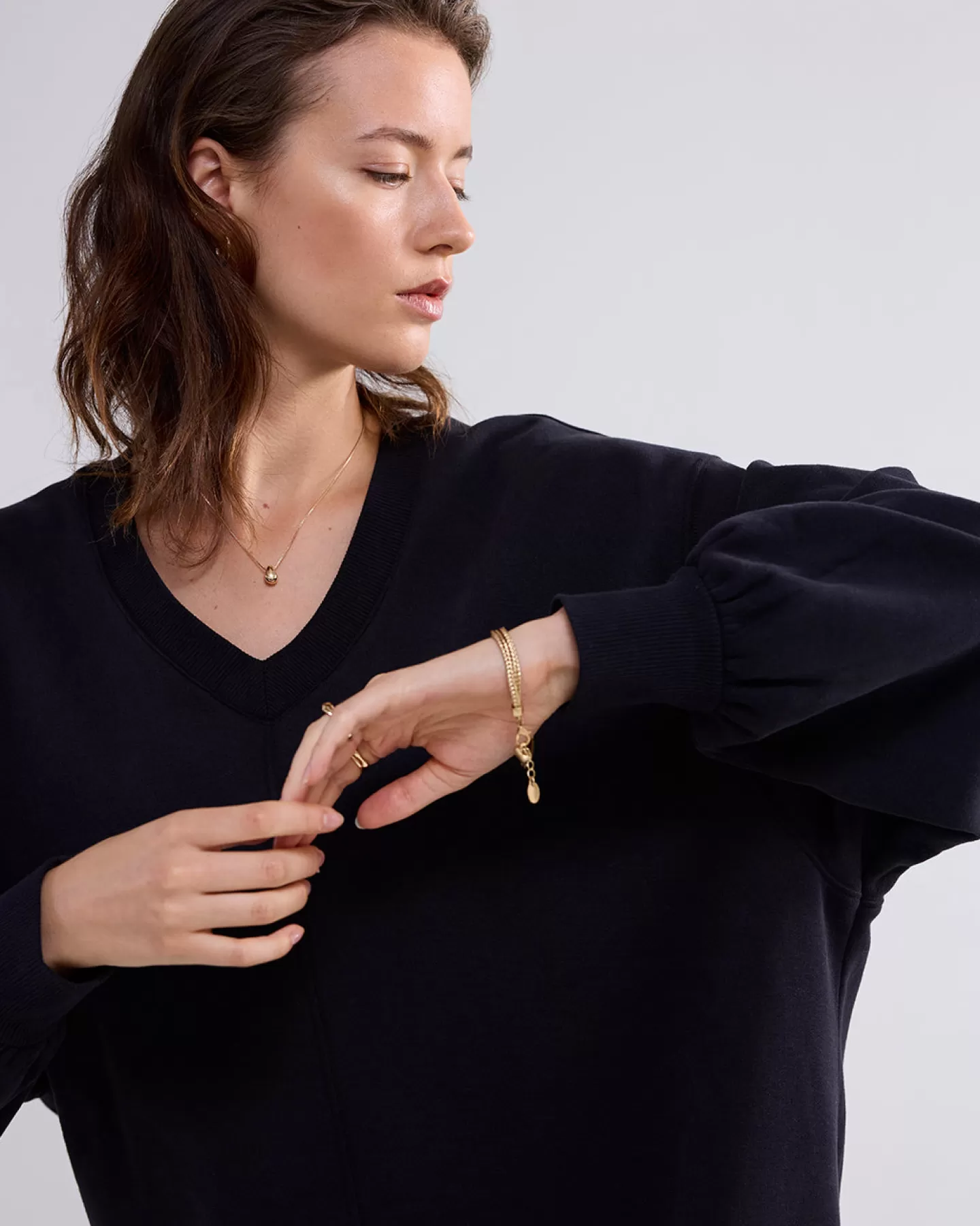 Oversized sweatjurk met V-hals en lange mouwen, gemaakt van zachte katoenen jersey. De jurk heeft splitjes in de zijnaden.