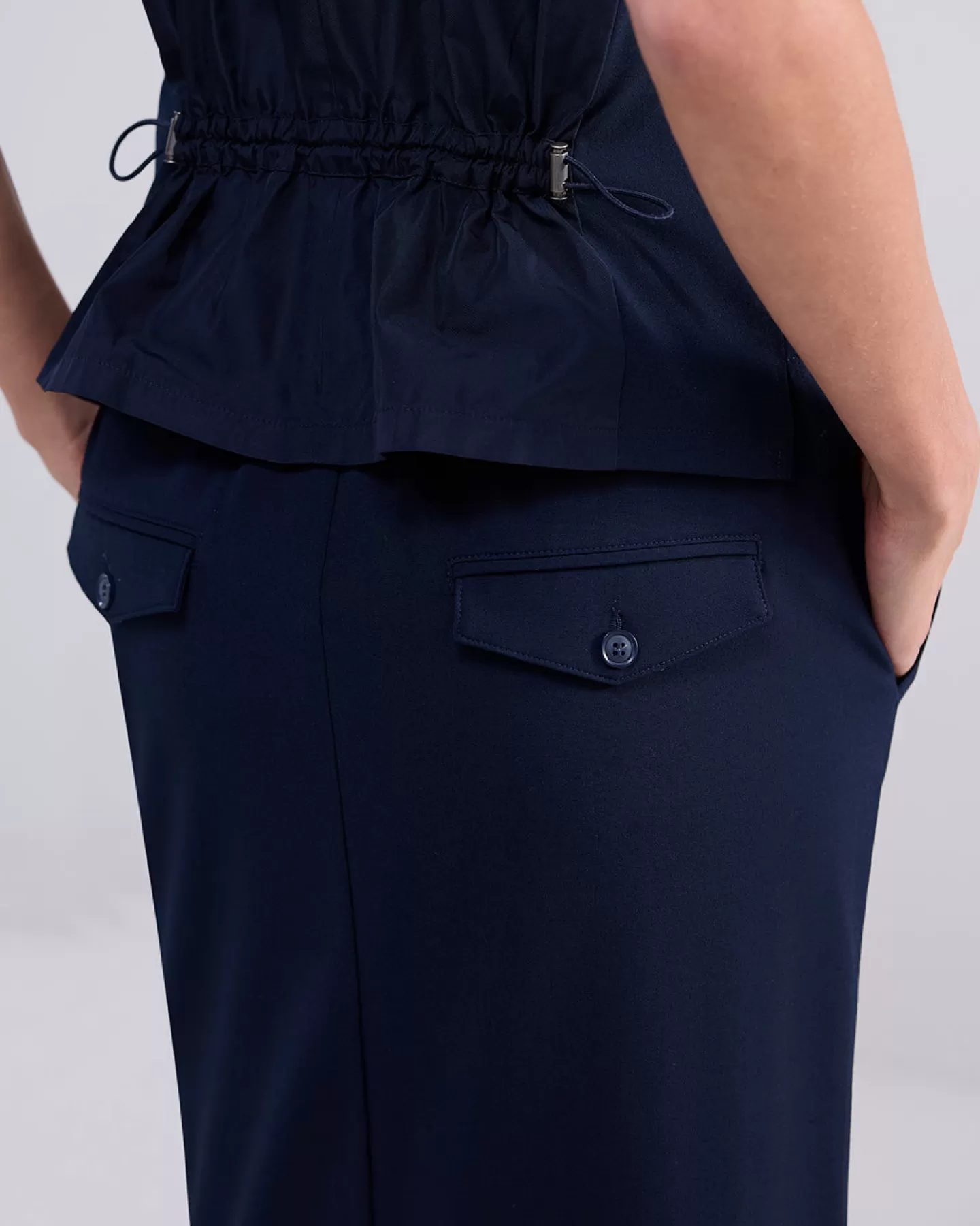 Lange pencil rok met hoge split middenvoor en elastische tailleband achter. De rok is voorzien van steekzakken voor en een paspelzak met klep achter.