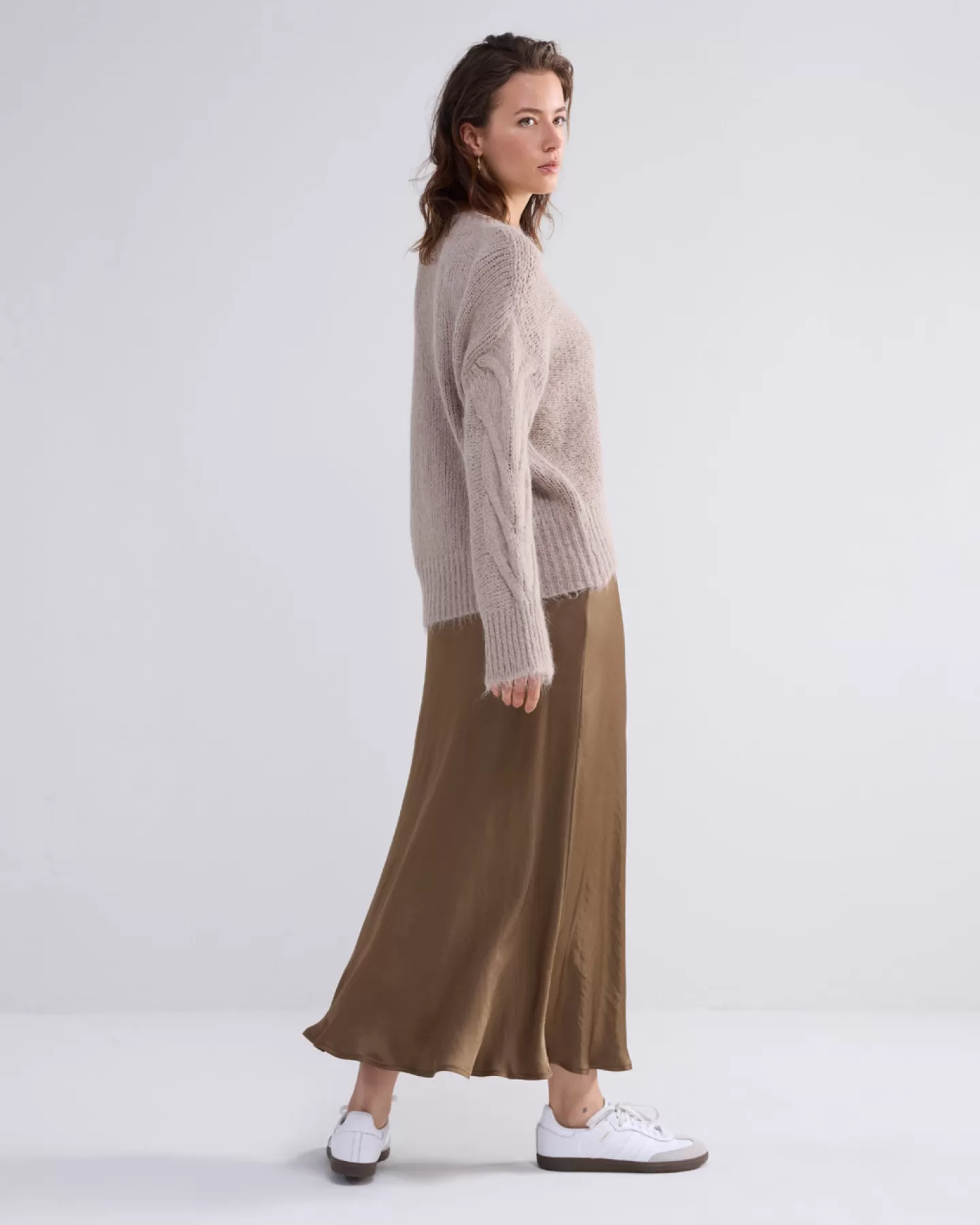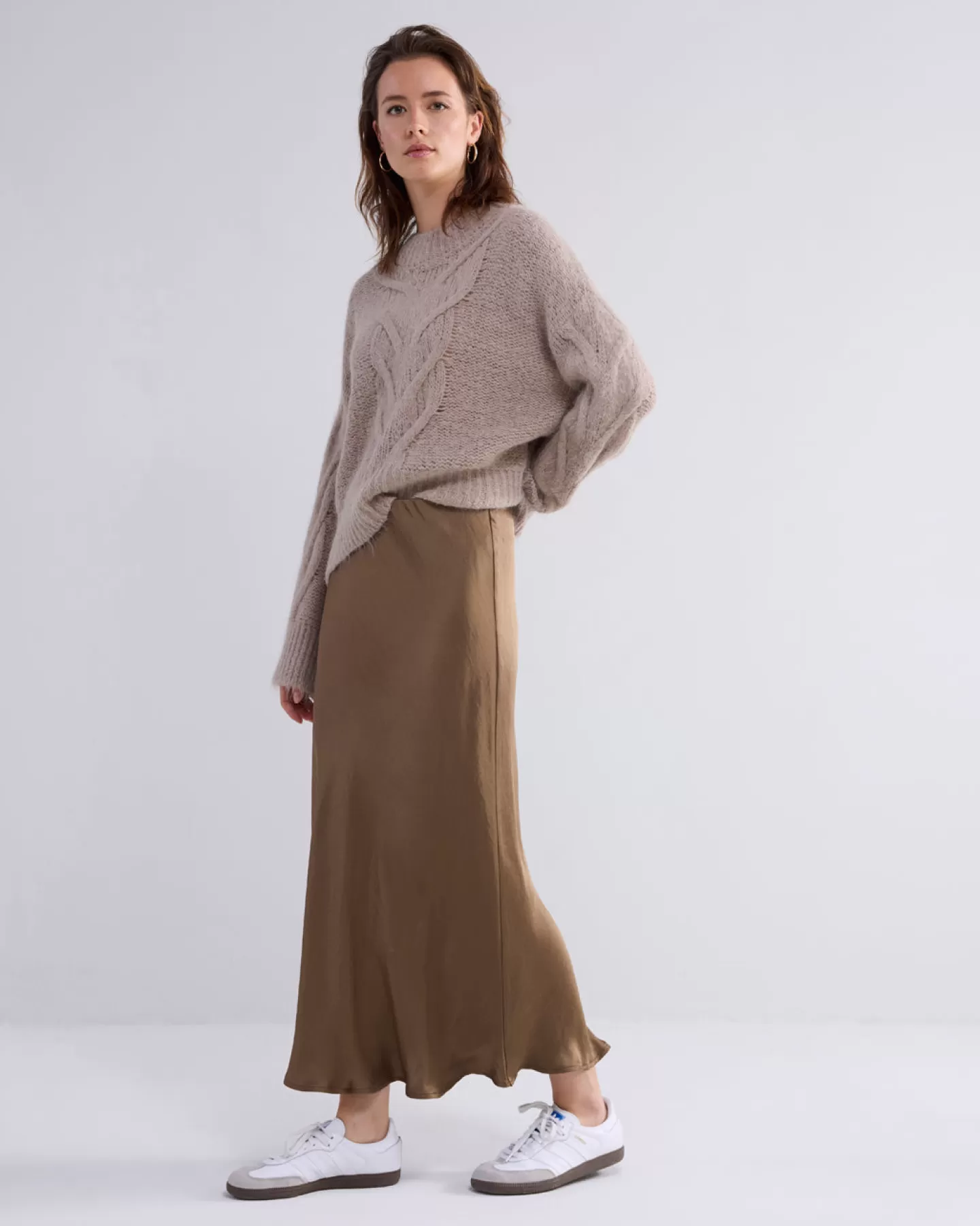 Schuingesneden lange rok tot ongeveer de kuit, voorzien van elastiek aan de binnenkant van de taille. Gemaakt van een soepele, glanzende kwaliteit.