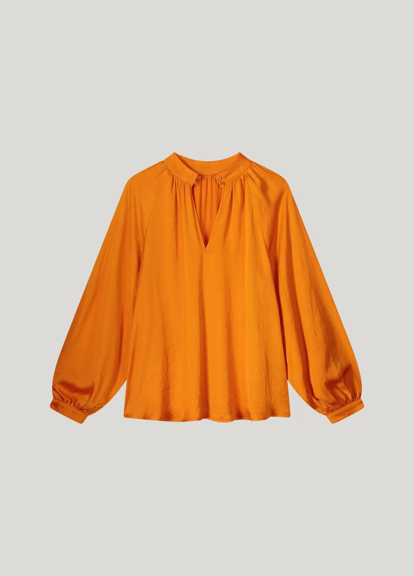 Top met hooggesloten hals die op twee manieren gedragen kan worden: met een hoge ronde hals of met een split en knoopje. Gemaakt van soepele glanzende stof met wijde raglanmouwen.