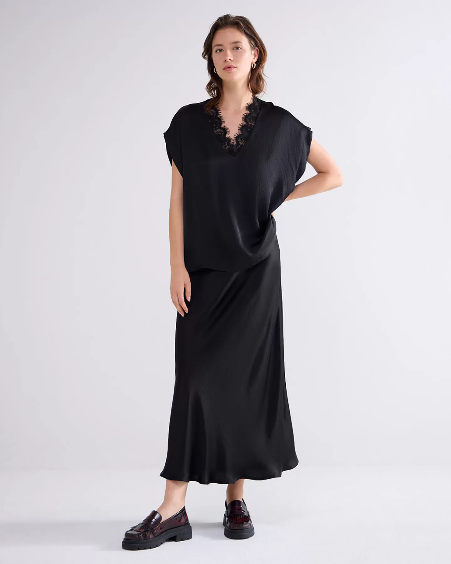 Mouwloze top met V-hals met een omlijsting van kant. De top is gemaakt van een licht glanzende stof met bewegend effect….