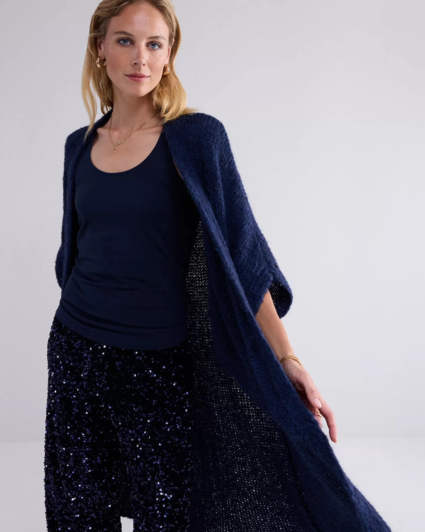 Lang kimonovest in een oversized pasvorm en gemaakt van een mohair blend. Het vest is uitgevoerd in een grove steek en heeft 3/4 mouwen.