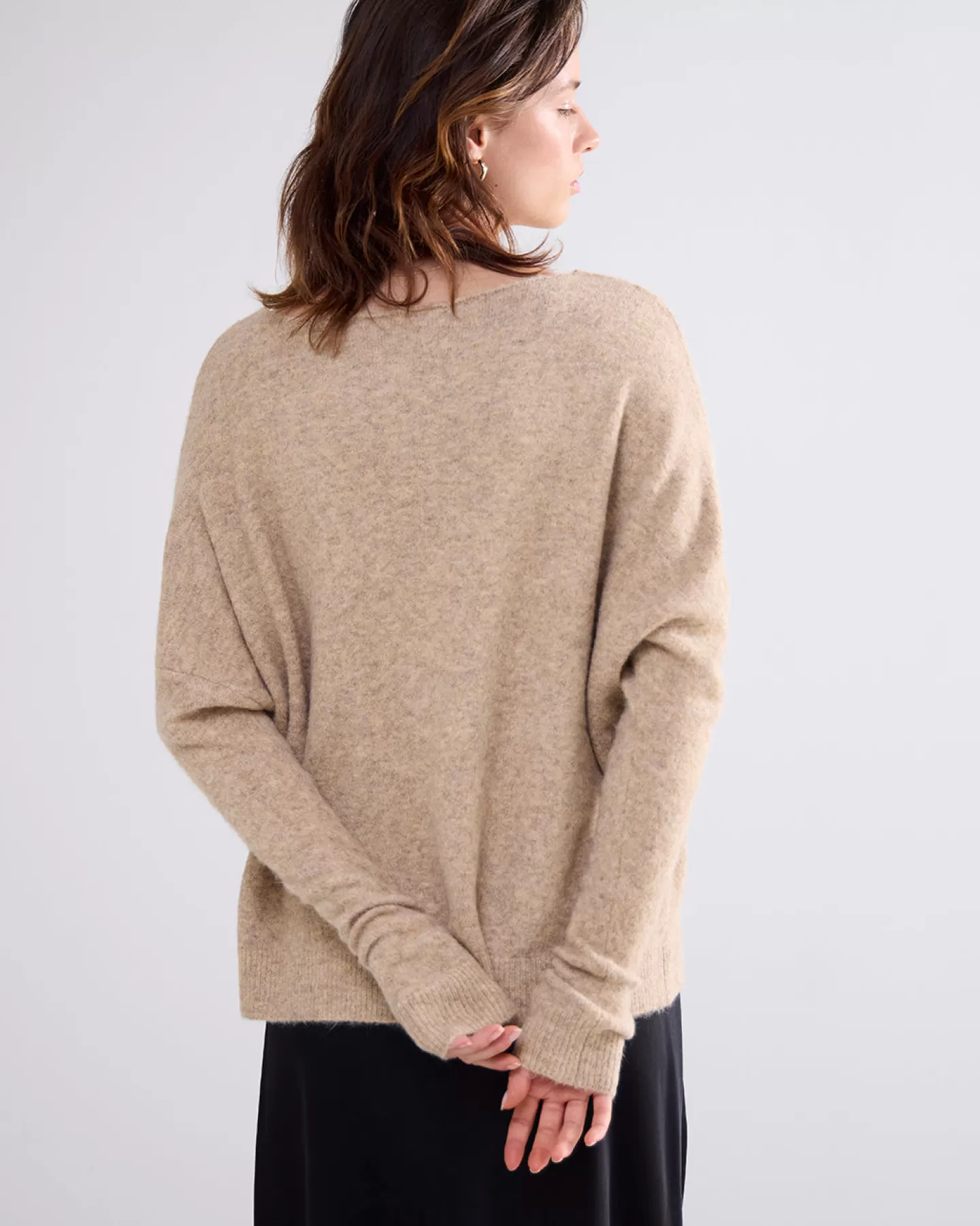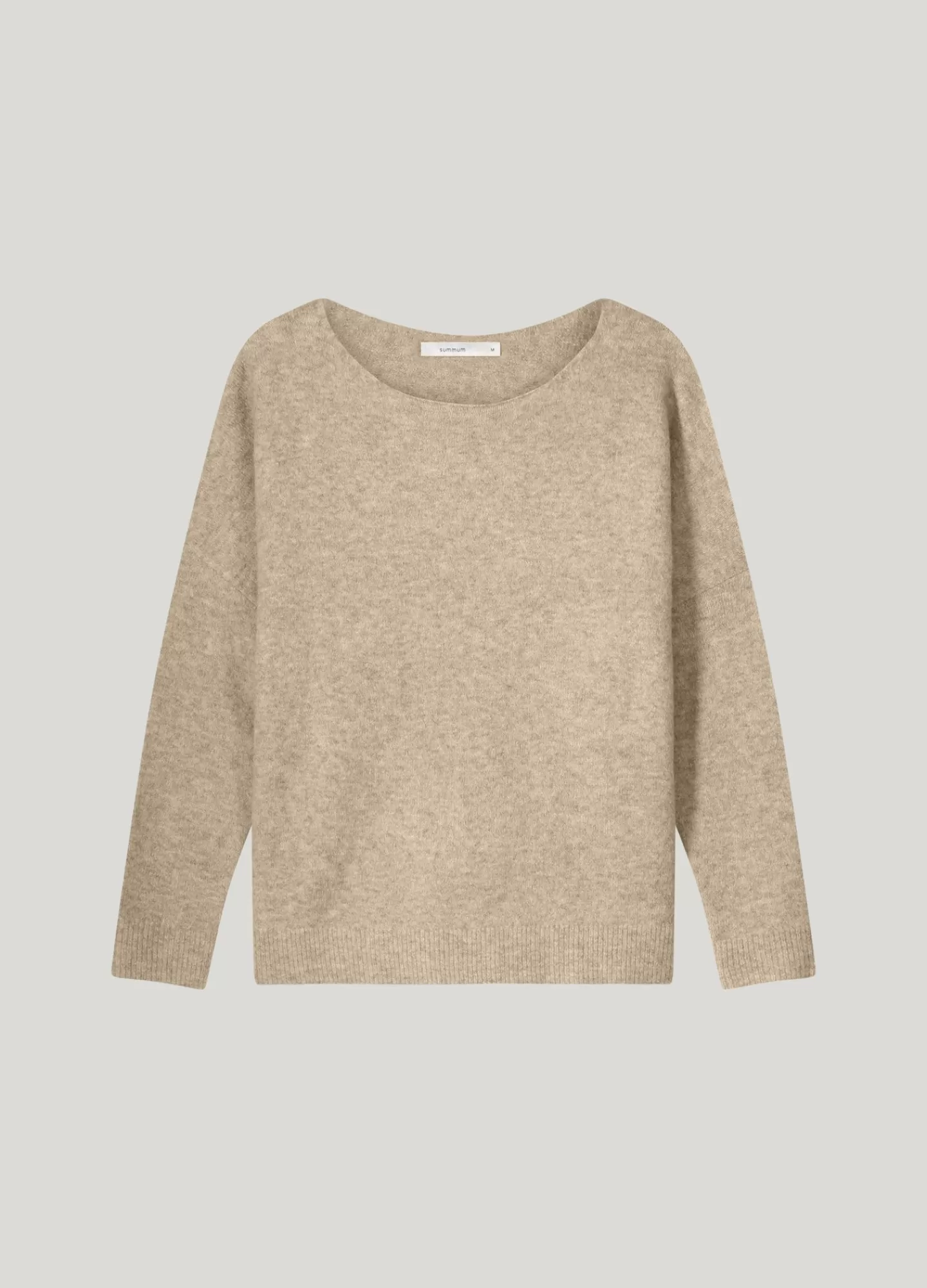 Trui met wijde boothals en ruime fit op de body, gebreid in een gemêleerd garen. De mouwen hebben een normale pasvorm.